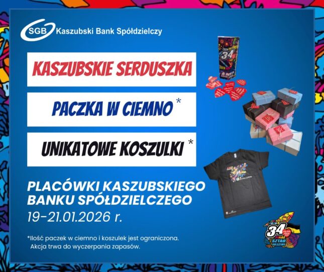 W dniach od 19 do 21 stycznia 2026 r. zapraszamy do placówek Kaszubskiego Banku Spółdzielczego i do wzięcia udziału w naszej wyjątkowej akcji na rzecz Wielkiej Orkiestry Świątecznej Pomocy.