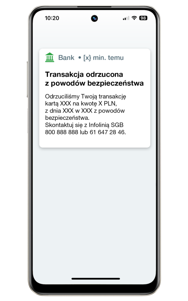 2. W treści wiadomości poprosimy Cię o kontakt z Infolinią SGB i potwierdzenie próby płatności.