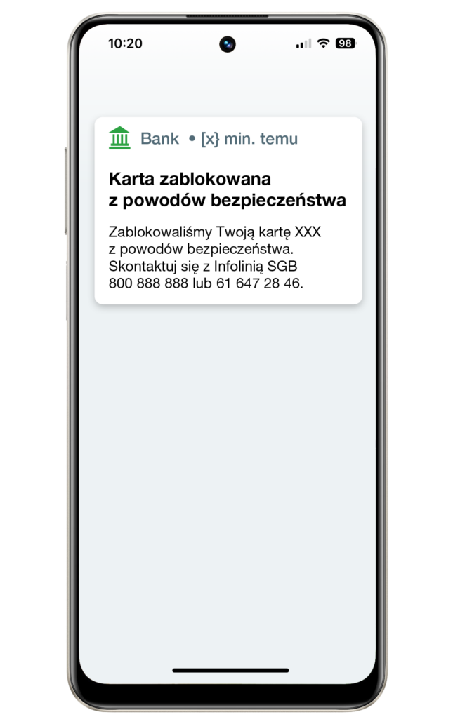 Jeśli zablokujemy Twoją kartę, otrzymasz dodatkowo wiadomość: