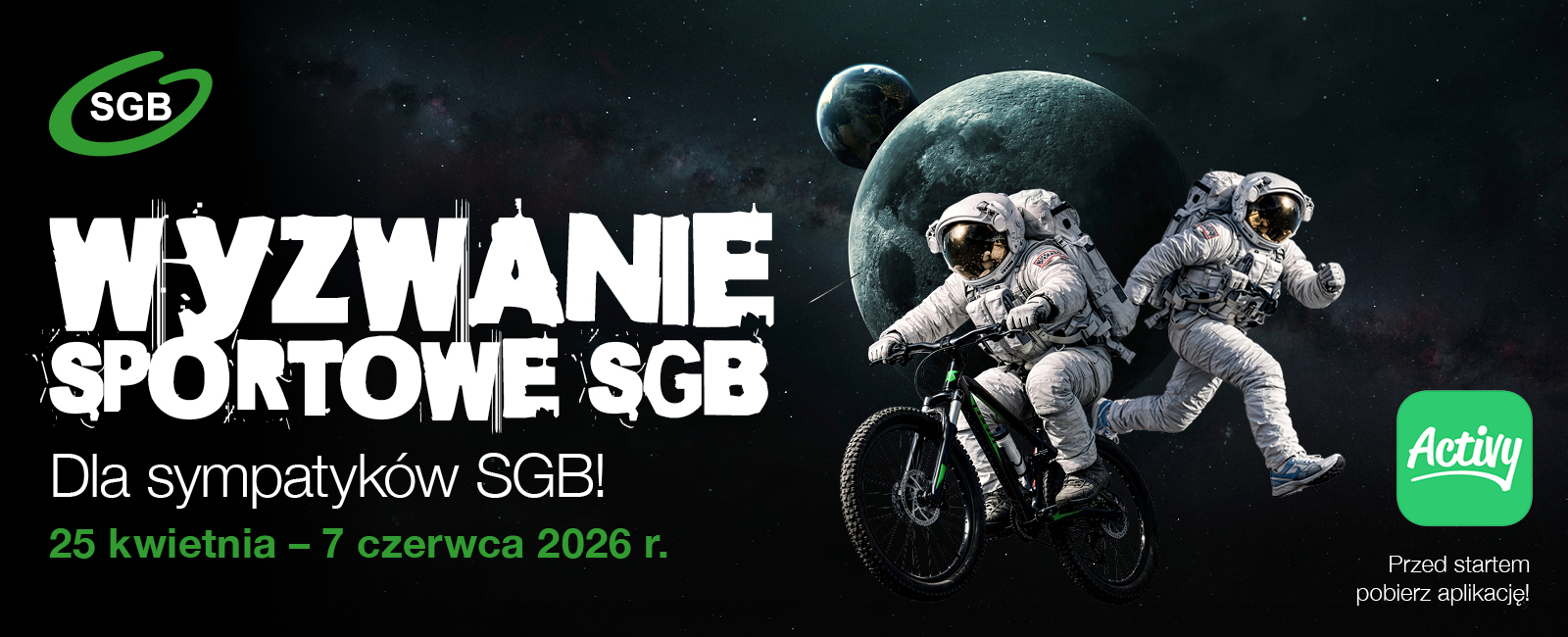 Wyzwanie Sportowe SGB w tym roku będzie trwało od 25 kwietnia do 7 czerwca. W tym czasie wspólnie z aplikacją Activy będziemy pokonywali kilometry na kołach (rower/rolki) oraz na nogach (bieganie/chodzenie). Kilometry przeliczane są na punkty, a te w efekcie oprócz nagród indywidualnych i drużynowych dla uczestników, przełożą się także na konkretną pomoc dla potrzebujących.